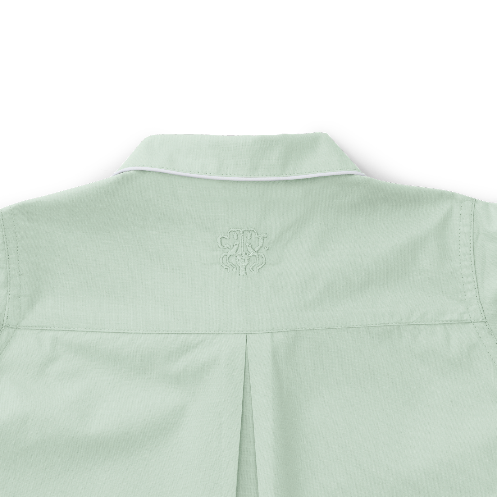 Skjorten har sideslidser, brystlomme, afrundet krave og Georg Jensen Damasks ikoniske logo broderet på bærestykket i nakken. Bukserne har en bred og behagelig elastik i taljen og lommer. Bukse- og ærmelængde kan let tilpasses med et opsmøg, hvor indersiden har en elegant piping.