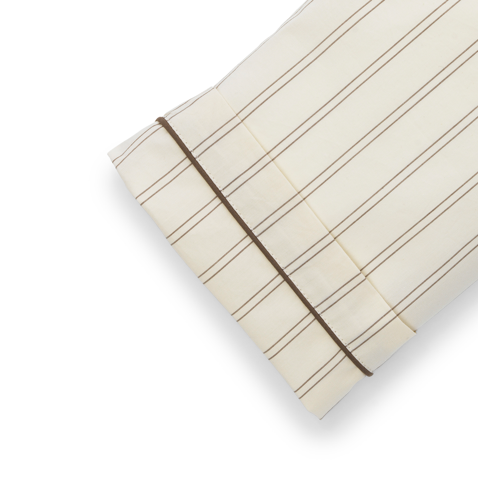 Unisex pyjamas til børn percalevævet i supimabomuld. Pyjamassen har et klassisk snit, elegante pipings og slanke nålestriber i Walnut med en baggrund i farven Archive Linen - en lys, nøddefarvet nuance.