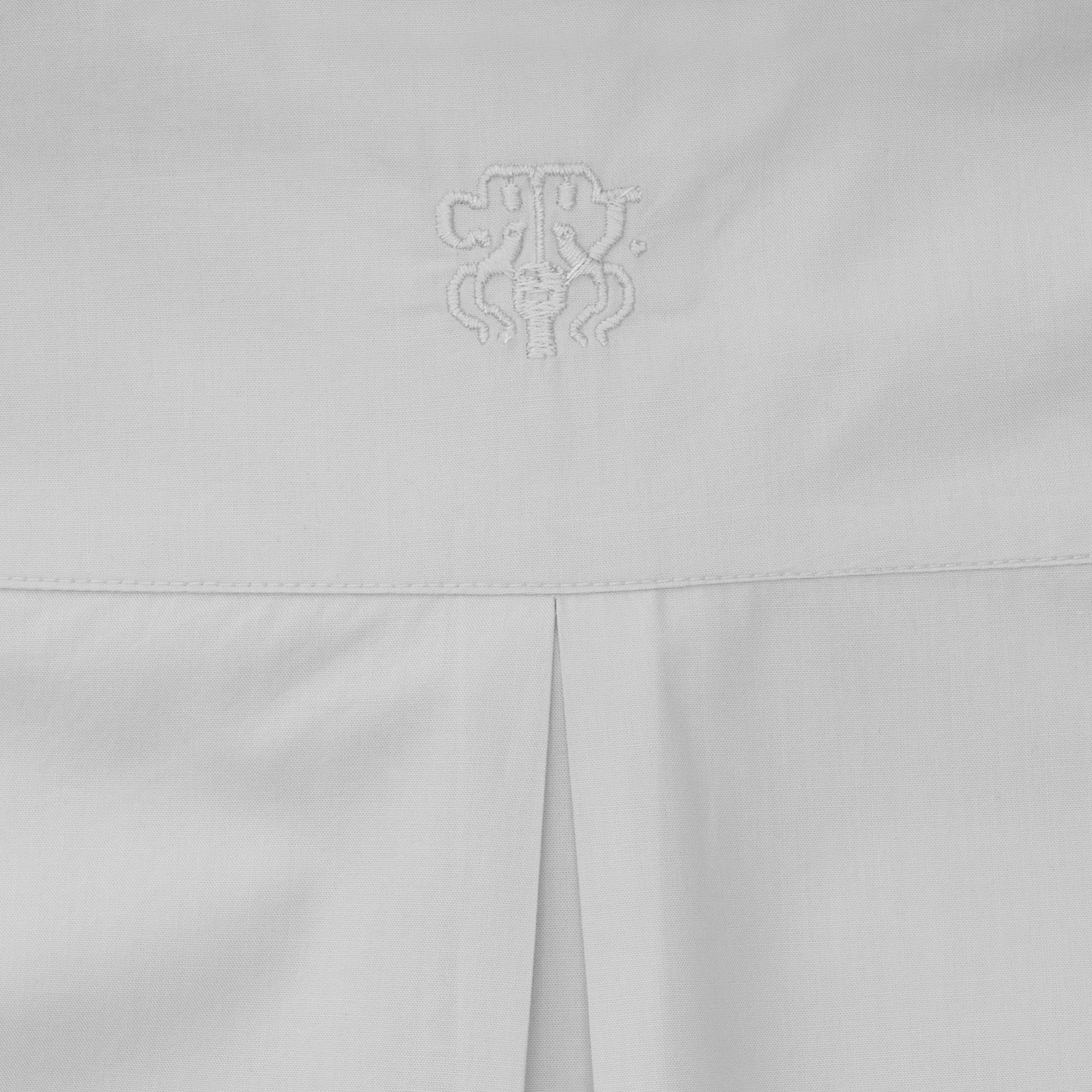 Skjortekjolen har et klassisk snit og elegante, hvide pipings. Den har sideslidser, indvendige sidelommer, kinakrave og Georg Jensen Damasks ikoniske logo broderet på bærestykket i nakken.