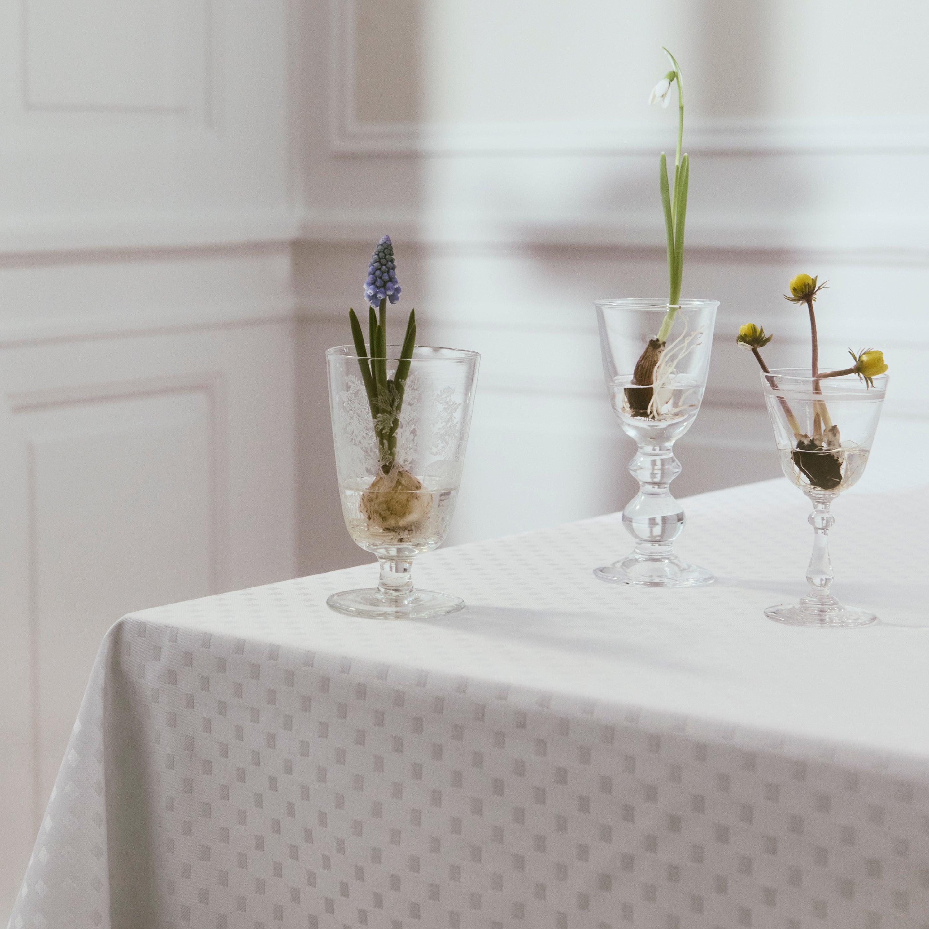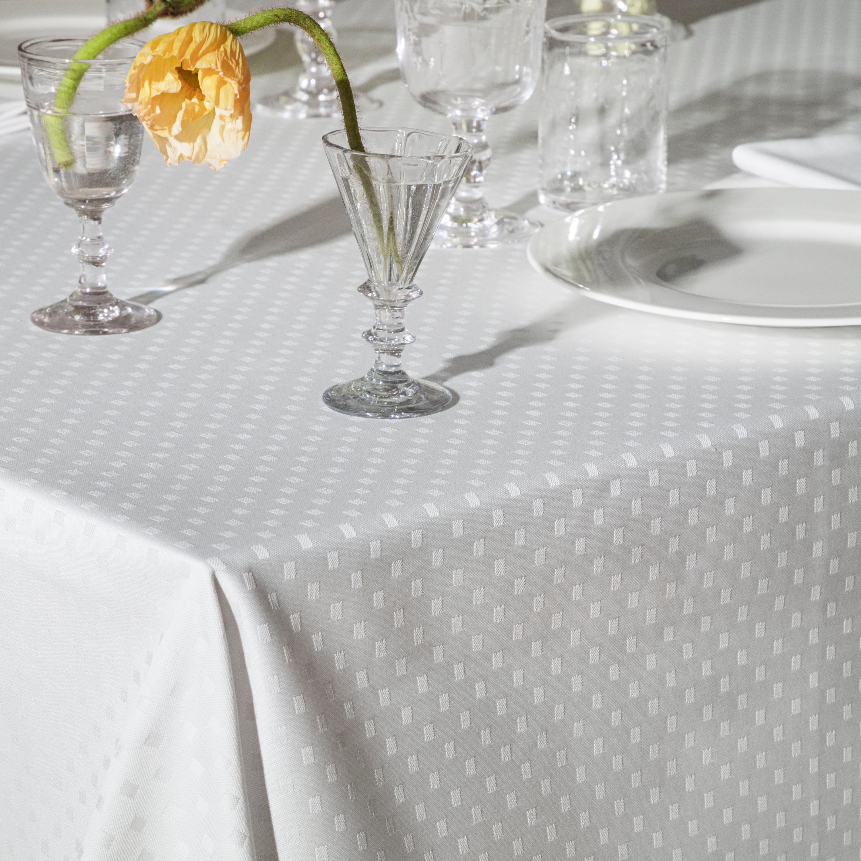 Wat blijft het damasten tafelkleed als een studie in wit. Een blanco canvas dat niet vraagt om een specifieke interieurstijl, maar wordt aangevuld met accessoires naargelang stemming, seizoen en maaltijd.
