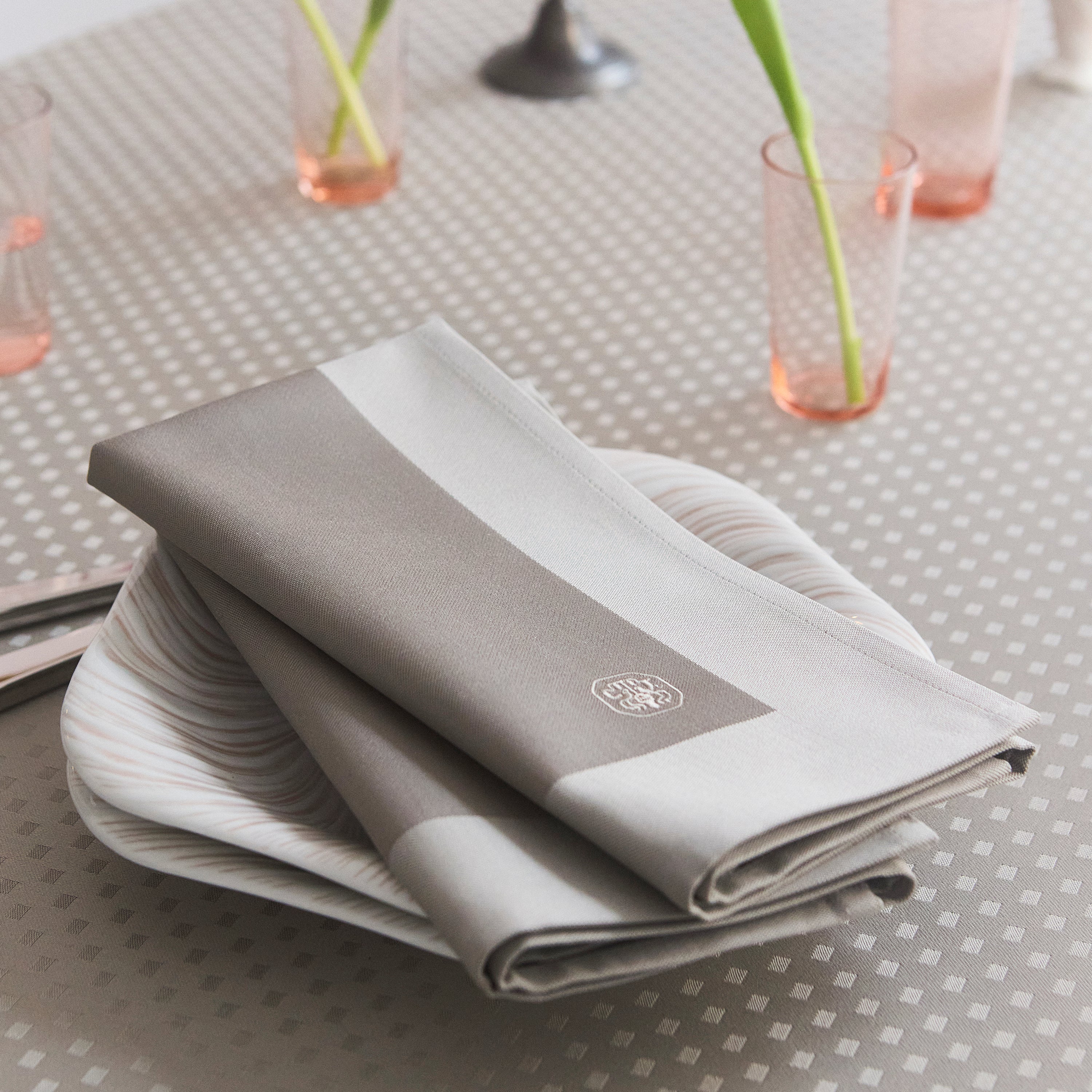 De kleur Greige is een gedempte grijs-beige tint. De kleur heeft een exclusieve uitstraling en laat het fijne damast geweven patroon goed uitkomen.