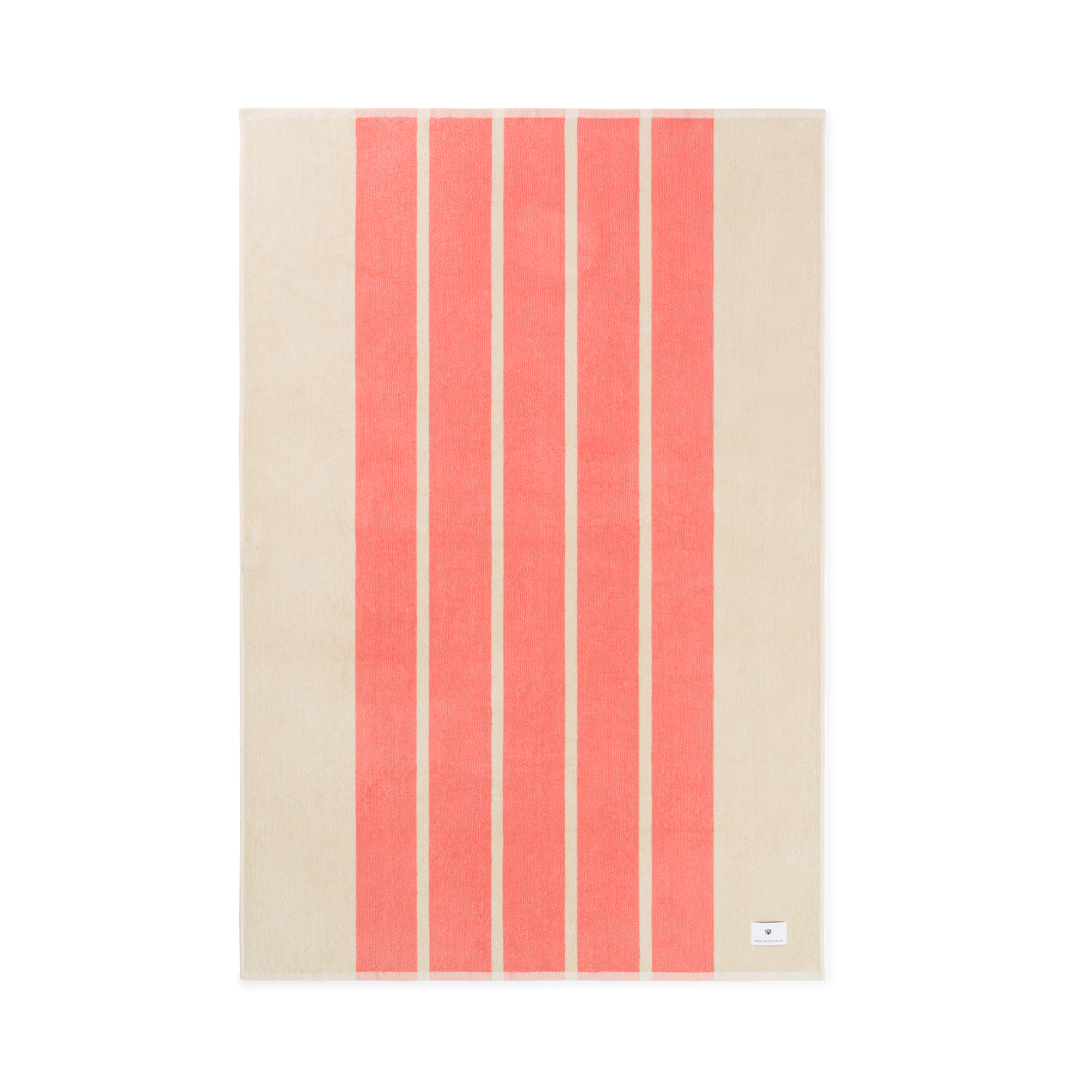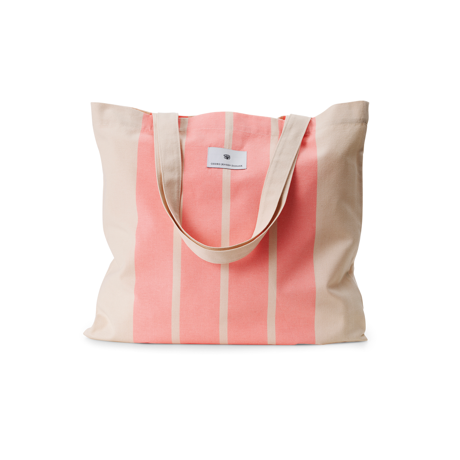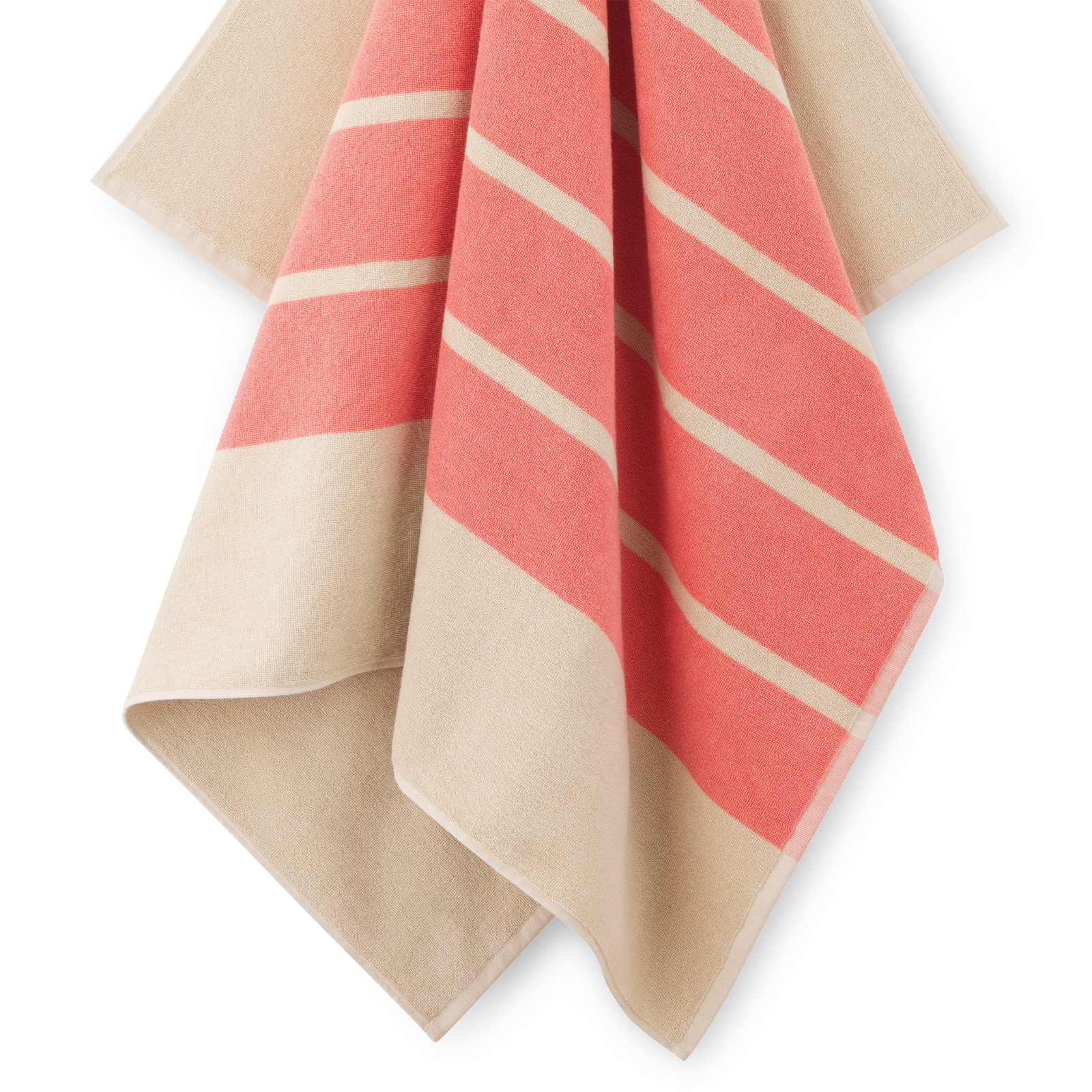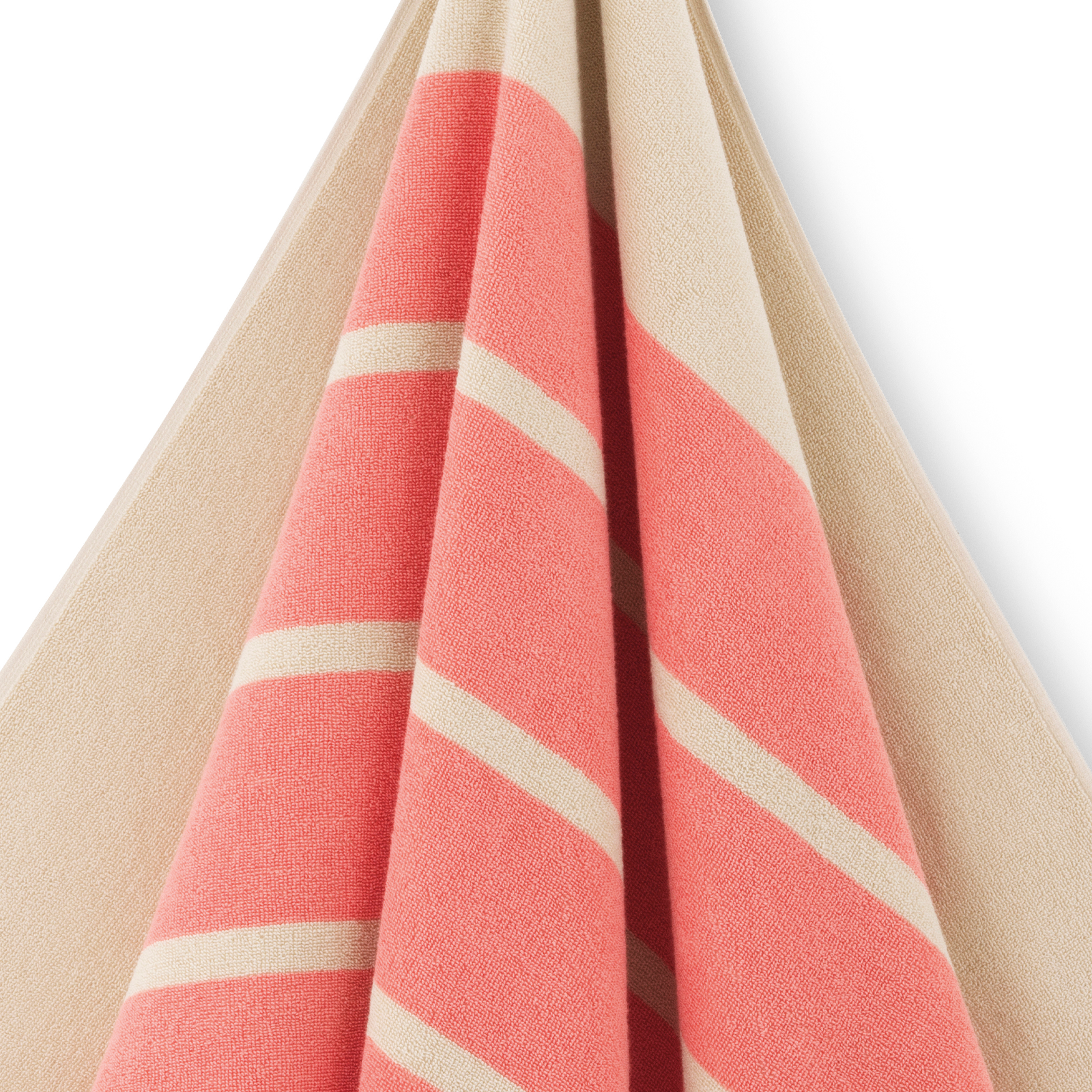 Set met Sun Stripe badlaken en canvas tas in de kleur Coral Pink met lichtroze strepen op een zandkleurige basis.
