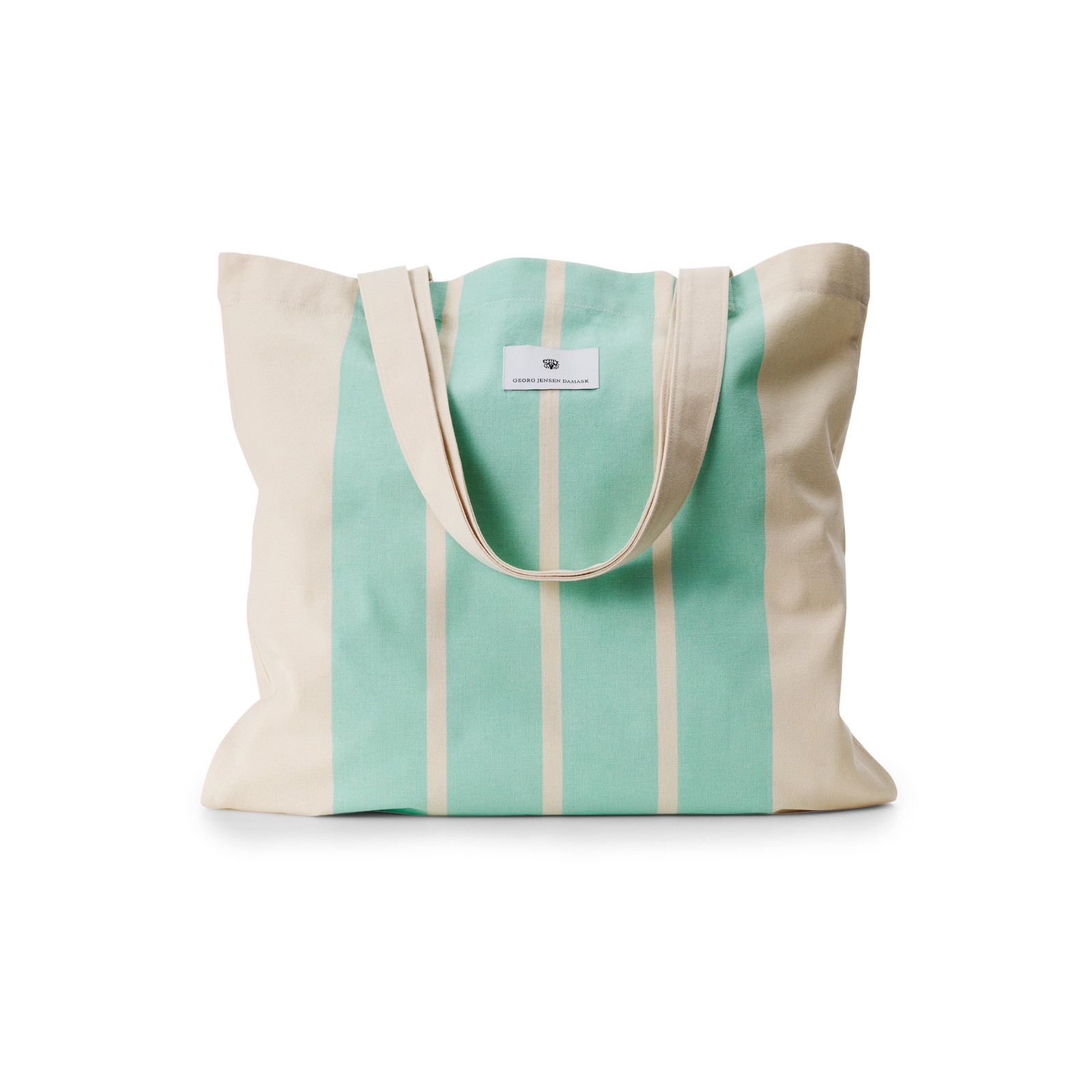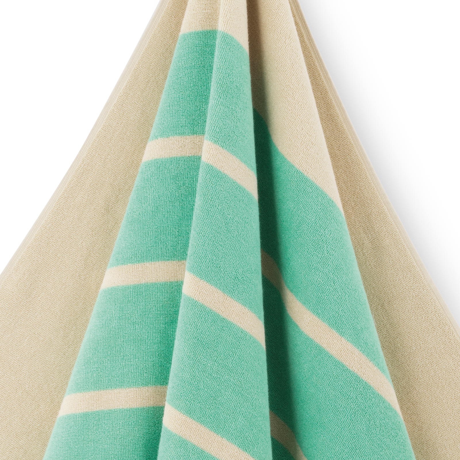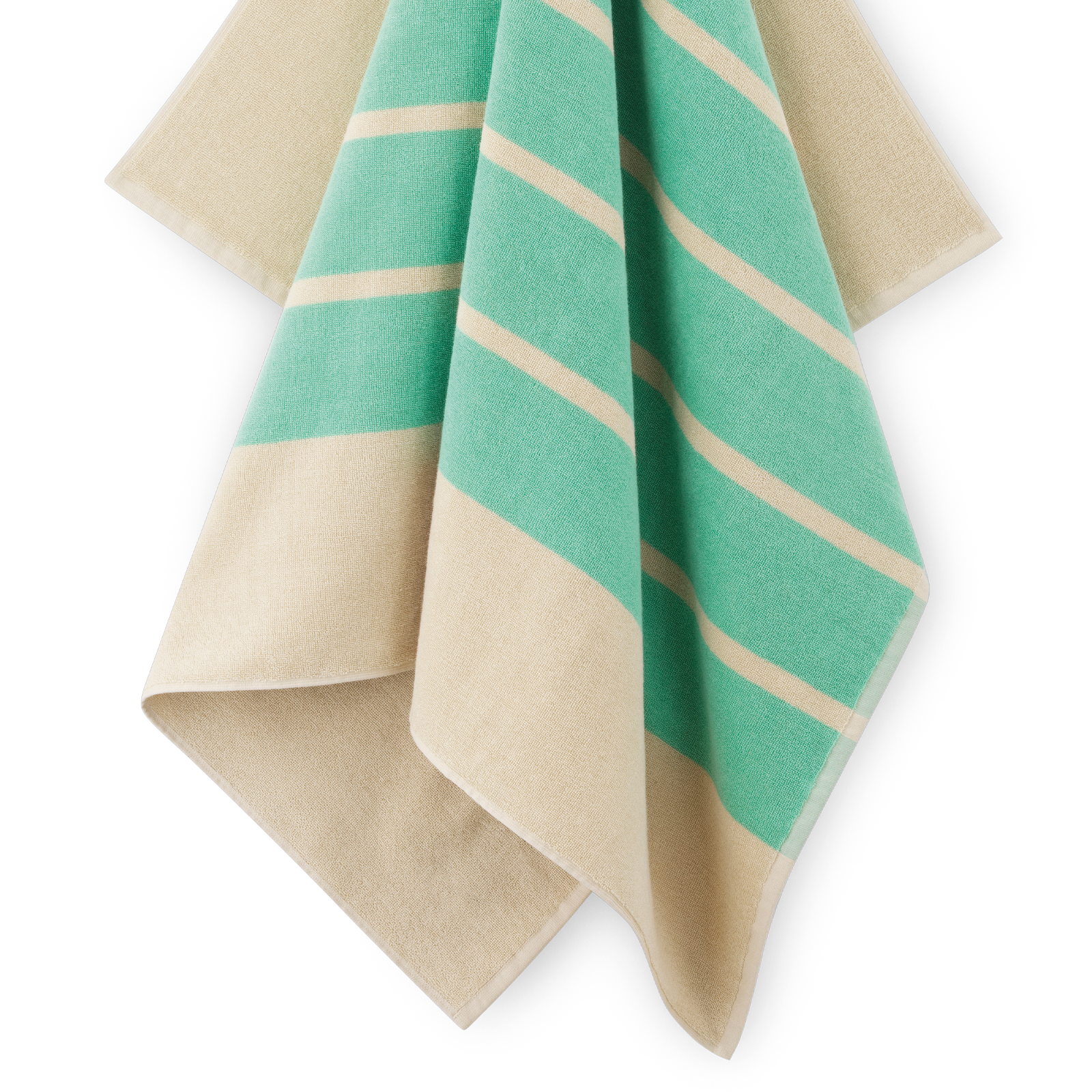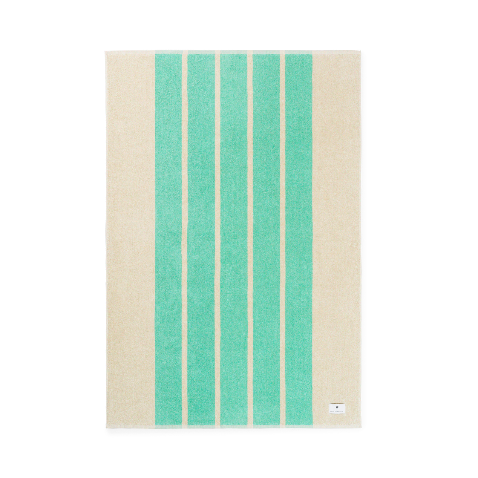 Set met Sun Stripe badlaken en canvas tas in de kleur Mint Green met turquoiseblauwe strepen op een zandkleurige basis.