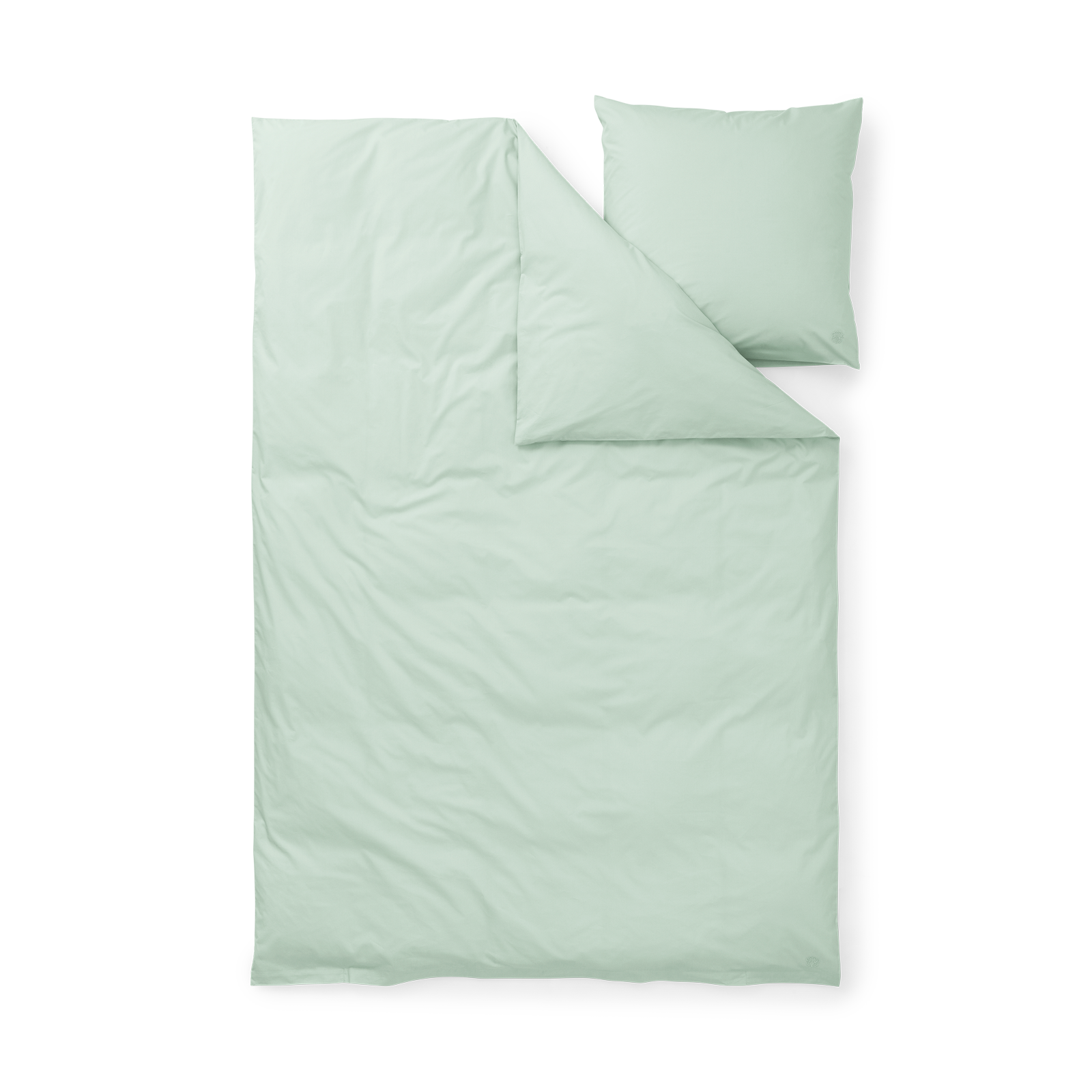 Het dekbedovertrek sluit met bandjes en de kussensloop heeft een envelopsluiting. De beddengoedset is voorzien van het iconische logo van Georg Jensen Damask als discreet borduursel. De helder groenblauwe kleur, Glass Green, is geïnspireerd op de kleur van ruw glas.