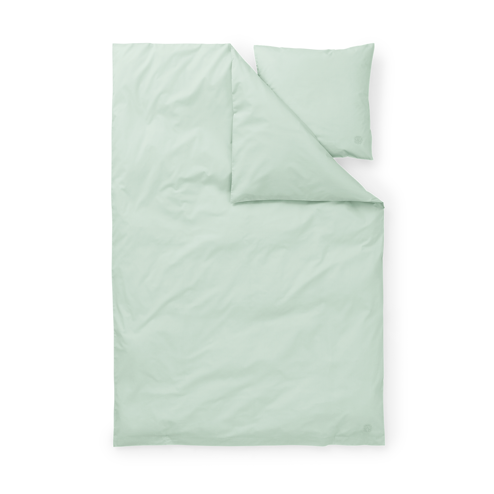 Het dekbedovertrek sluit met bandjes en de kussensloop heeft een envelopsluiting. De beddengoedset is voorzien van het iconische logo van Georg Jensen Damask als discreet borduursel. De helder groenblauwe kleur, Glass Green, is geïnspireerd op de kleur van ruw glas.