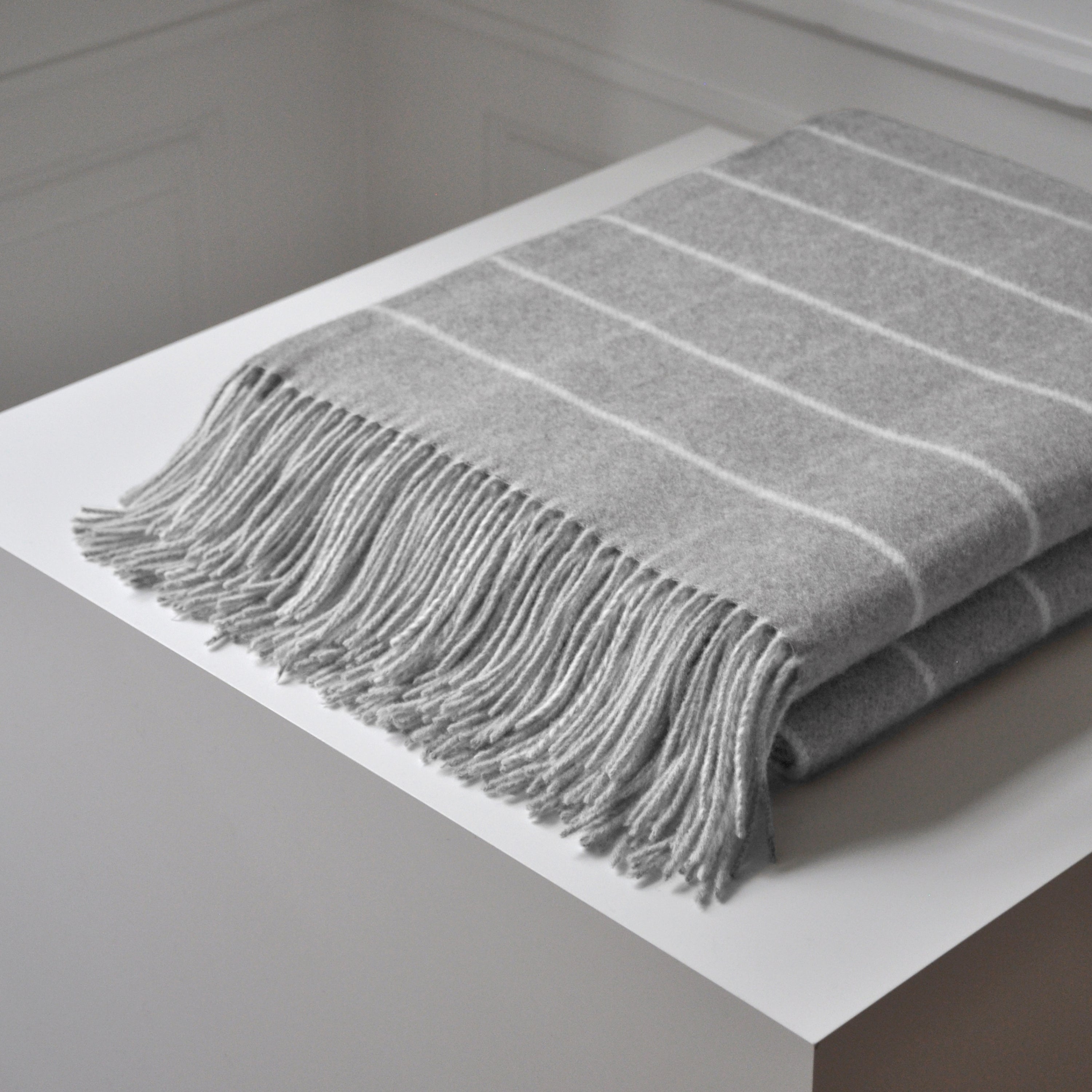 Tender Grid heeft een elegant, geruit patroon dat de plaid een klassieke uitstraling geeft. De combinatie van 90% merinowol en 10% kasjmier maakt de plaid extra zacht en de fijne structuur van de wol zorgt voor een bijzondere luchtigheid. De throw is geweven in lichtgrijs en heeft lange franjes.