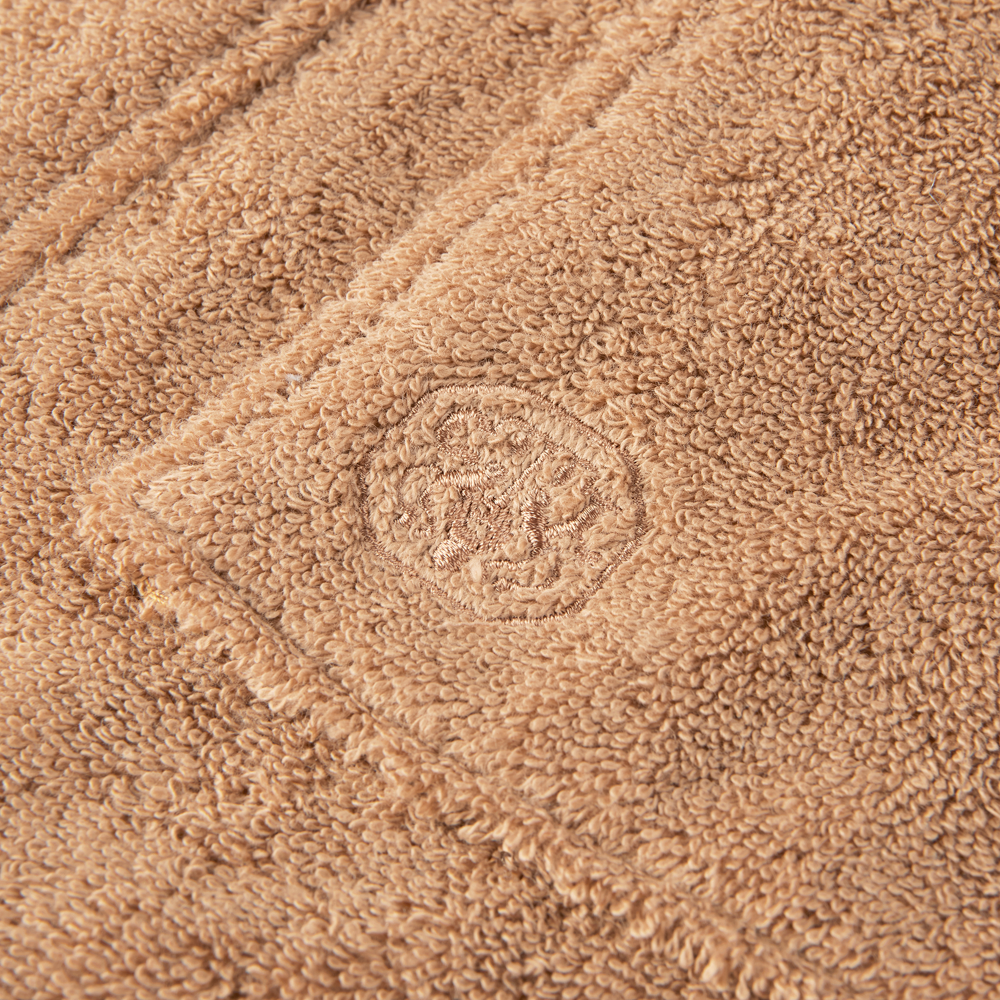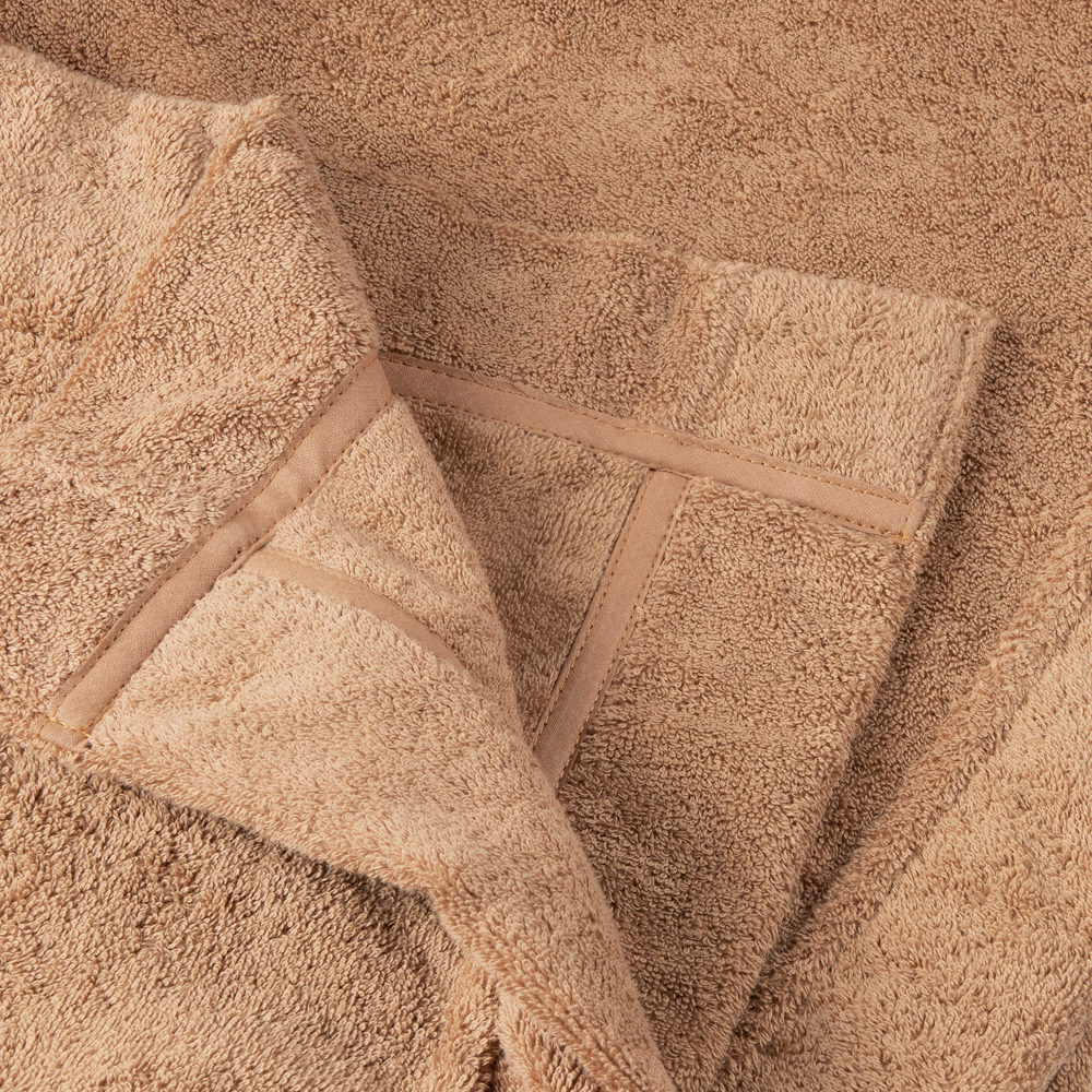 De badjas heeft twee grote voorzakken met een geborduurd logo en een lengte tot onder de knie. Hij heeft katoenen randen aan de binnennaden - een exclusief detail voor extra comfort.