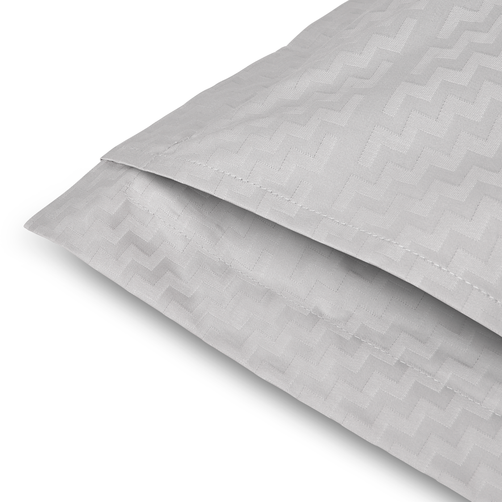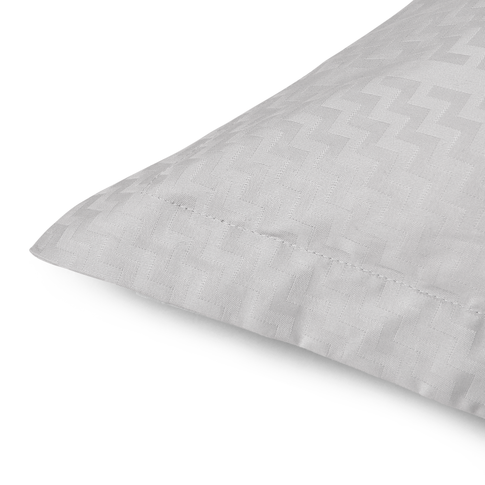Het geometrische patroon van het Tripp-dessin heeft de vorm van een trap, wordt herhaald en alleen onderbroken door een verticale lijn. Eenvoudig en harmonieus. Het patroon op de kussenhoes komt prachtig tot zijn recht in het damastweefsel en wordt nog versterkt door de elegante lichtgrijze kleur Silver Cloud.