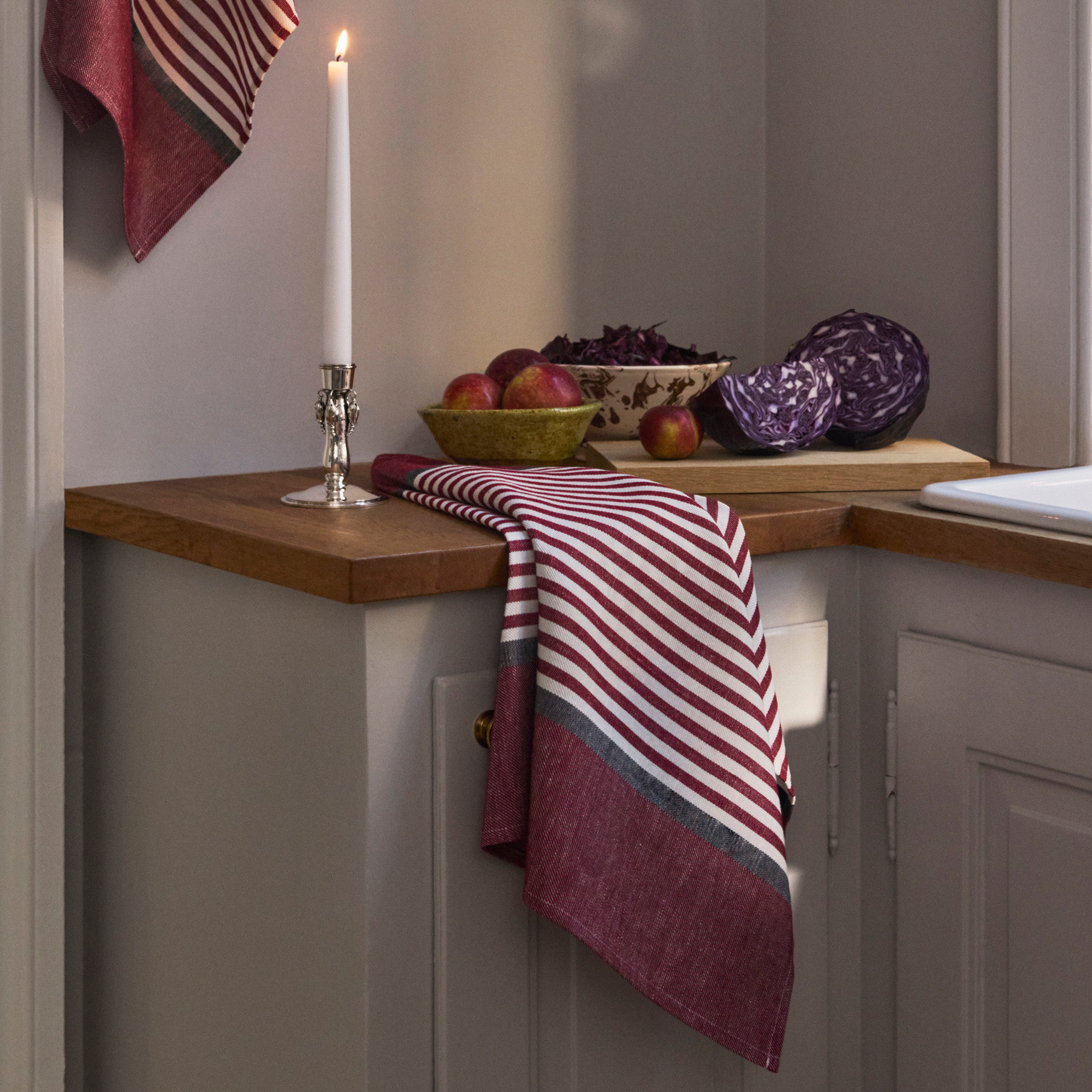 Det stribede Abild viskestykke er en klassiker i Georg Jensen Damasks kollektion. Viskestykket er vævet i en kombination af 50 % hør og 50 % bomuld, der giver det optimale tørreegenskaber. Abild viskestykket fås i mange farver og er både smukt alene eller i kombination med andre viskestykker og køkkenhåndklæder. Farven Carmine Red er en dyb og distingveret rød med en kølig undertone.
